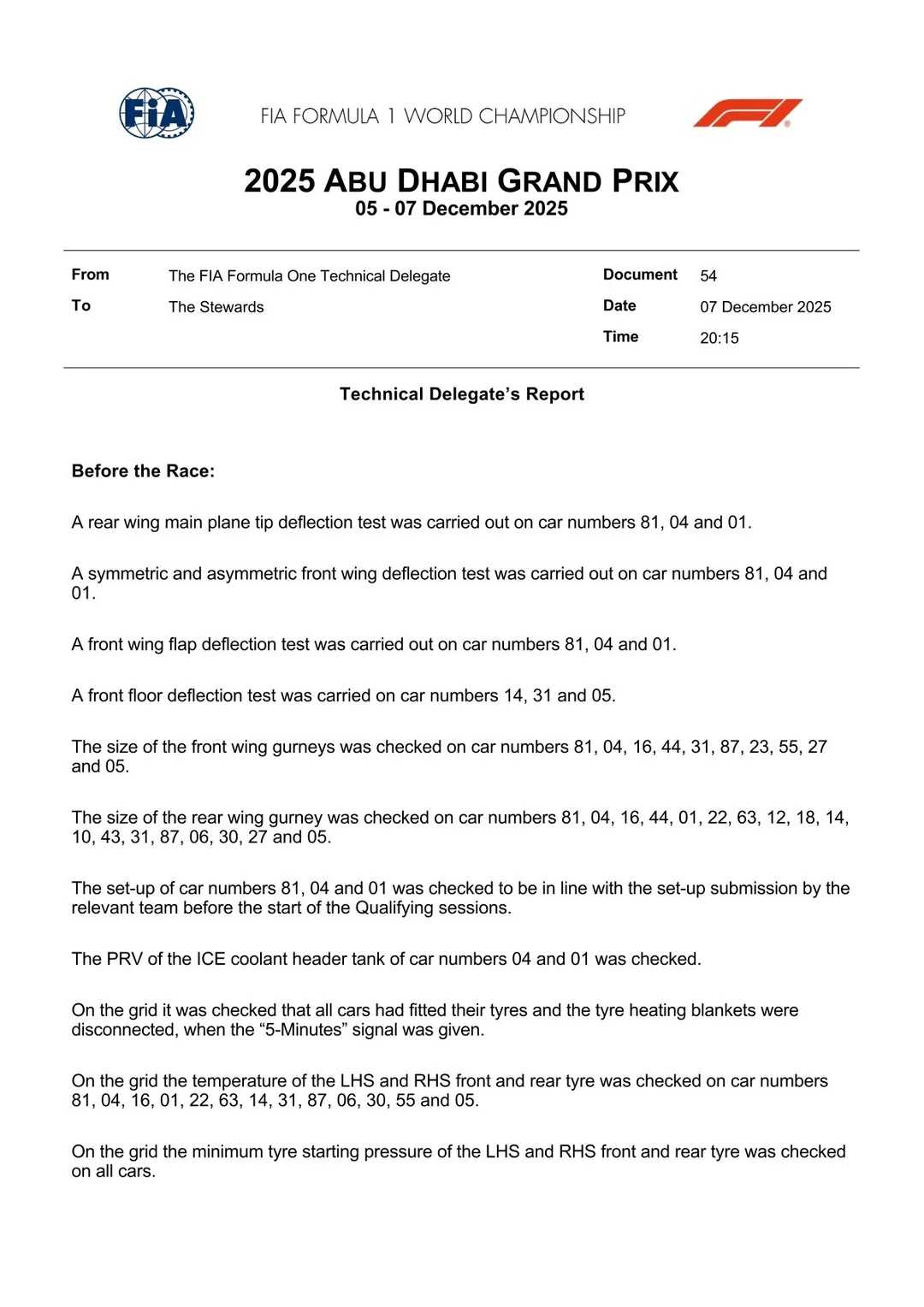 Na de race in Abu Dhabi voerde de FIA een grondige controle uit op de drie best geklasseerde auto’s van het seizoen. Daarbij werden onder meer de voorvleugels, gewichten, brandstofmonsters en bodemplanken onderzocht. De Red Bull van Verstappen doorstond de inspectie zonder problemen. Ook de McLaren-auto’s van Norris en Piastri bleken volledig in orde, wat eerdere zorgen over technische onregelmatigheden wegnam. Deze uitkomst voorkwam juridische nasleep en bevestigde dat de wereldtitel uitsluitend op basis van sportieve prestaties werd beslist.