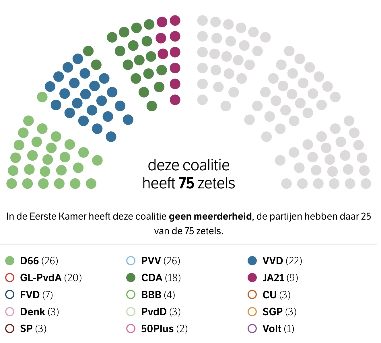 De nieuwe machtsverhoudingen zetten het formatieproces op scherp. De centrumrechtse coalitie waar VVD-leider Dilan Yeşilgöz de afgelopen weken op inzette, lijkt te wankelen. Volgens de huidige cijfers komen D66 (26 zetels), VVD (22), CDA (18) en JA21 (9) uit op 75 zetels – precies de helft van de Tweede Kamer.