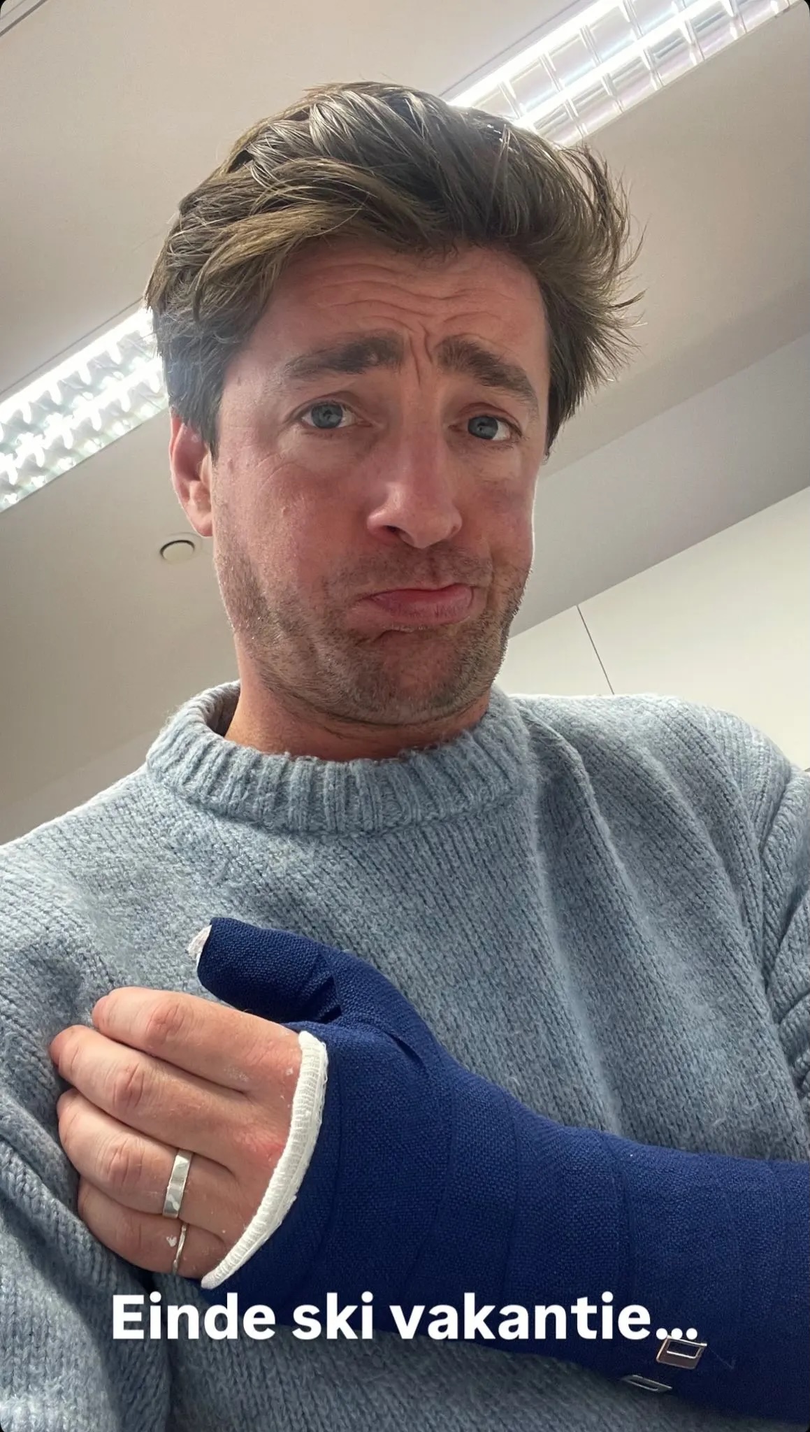 Op Instagram neem je zijn ervaring stap voor stap mee. “Hier was alles nog heerlijk…”, schrijft hij bij beelden waarop hij skiet. Even later volgt een sobere update met de woorden: “Toen iets minder…”, begeleid door een foto van zijn arm in het gips. Hij sluit af met: “Einde skivakantie…”. Je merkt dat humor helpt om de klap te verzachten. Toch blijft de teleurstelling zichtbaar aanwezig.