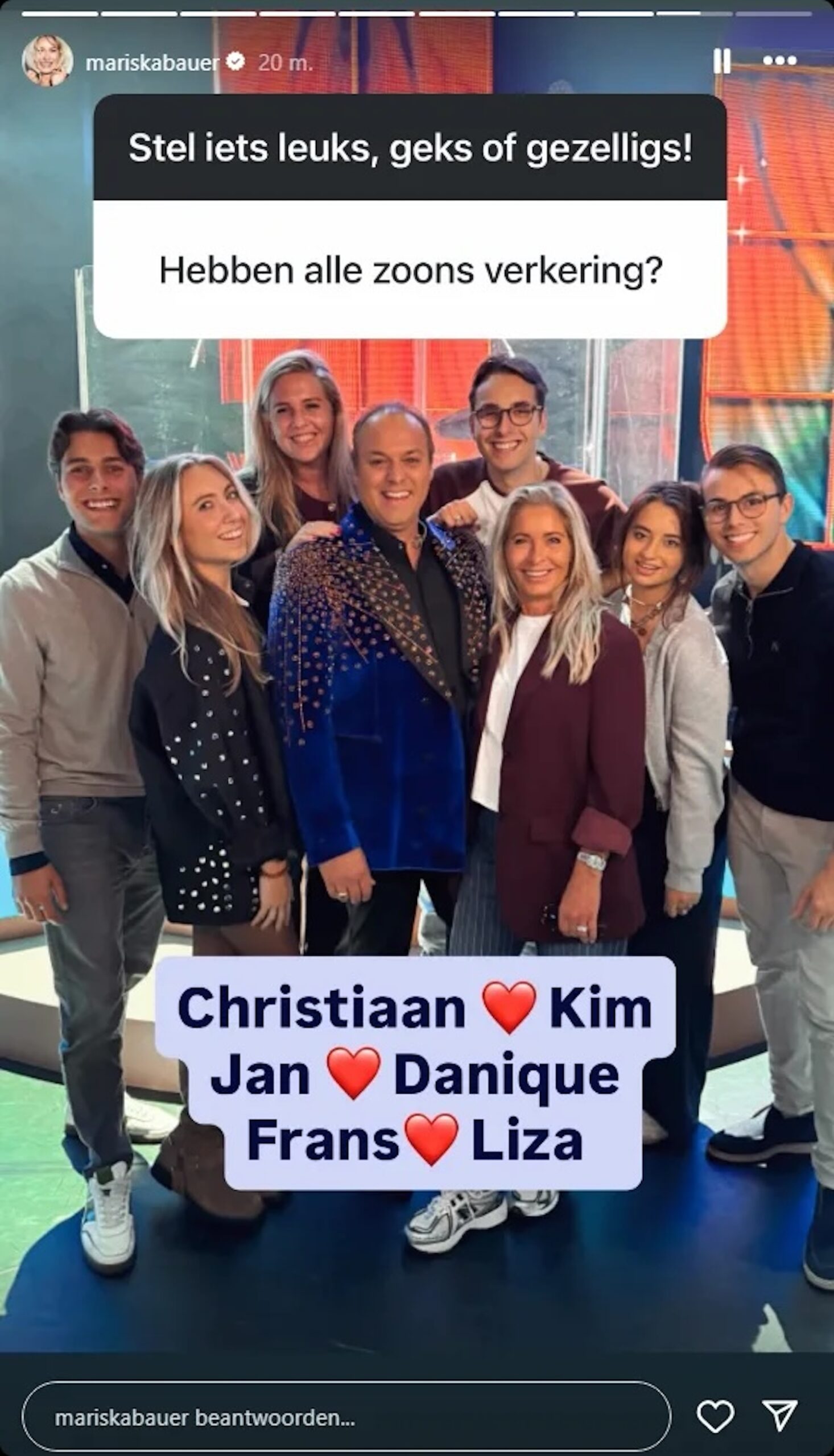 In haar Instagram Story bevestigde Mariska met trots dat al haar zonen inmiddels een relatie hebben. Ze liet weten dat Christiaan dolverliefd is op zijn vriendin Kim, Jan samen is met Danique en Frans Junior zijn hart heeft verloren aan Liza. De familie lijkt hechter dan ooit, wat door volgers met veel enthousiasme werd onthaald. De reacties stroomden binnen, met complimenten over hun warme band en de oprechte sfeer die de familie altijd weet uit te stralen.