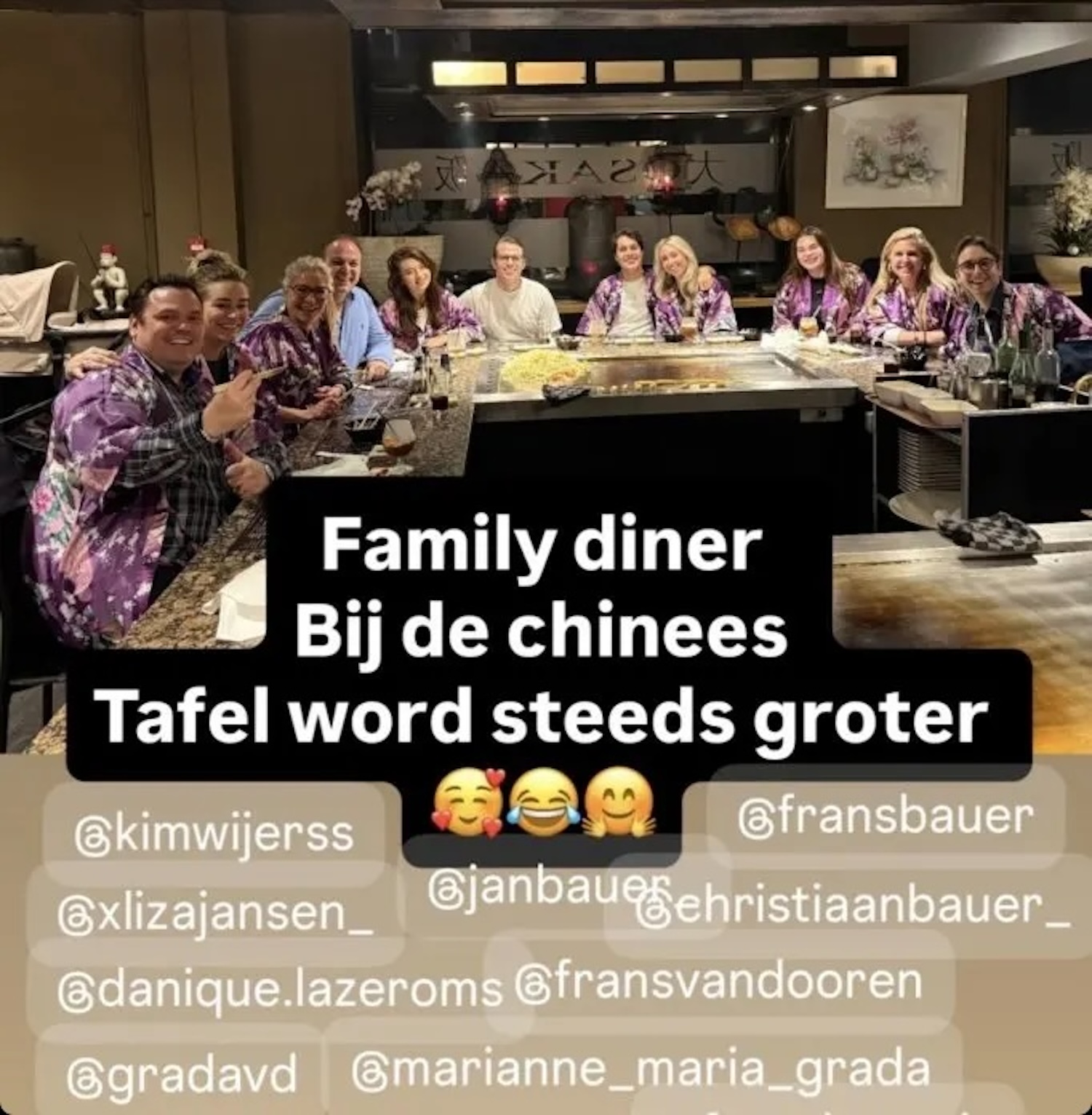 De tafel wordt steeds groter.” Later bleek dat de avond een feestelijke wending kreeg toen iedereen kimono’s aantrok om de Aziatische beleving compleet te maken. Mariska tagde daarbij ook Liza, de nieuwe vriendin van haar zoon.