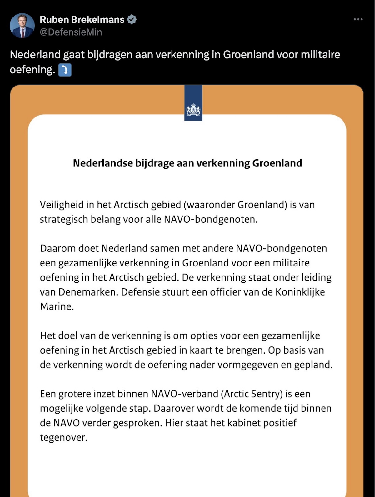 Je leest dat minister Brekelmans vooruitkijkt naar mogelijke vervolgstappen binnen NAVO-verband. Hij schrijft op X: “Een grotere inzet binnen NAVO-verband (Arctic Sentry) is een mogelijke volgende stap”. En vervolgt: “Daarover wordt de komende tijd binnen de NAVO verder gesproken. Hier staat het kabinet positief tegenover.” Daarmee geeft hij aan dat Nederland openstaat voor verdere betrokkenheid, afhankelijk van gezamenlijke besluiten.