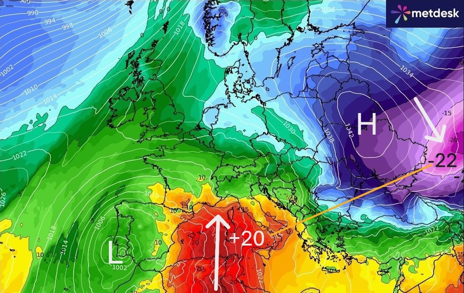 Terwijl het noorden van Europa afkoelt, blijft het zuiden opvallend warm. Een lagedrukgebied bij Portugal zuigt hete lucht uit Algerije richting de Alpen. Hierdoor ontstaat een groot contrast: vrieslucht in het noorden en zwoele lucht in het zuiden.