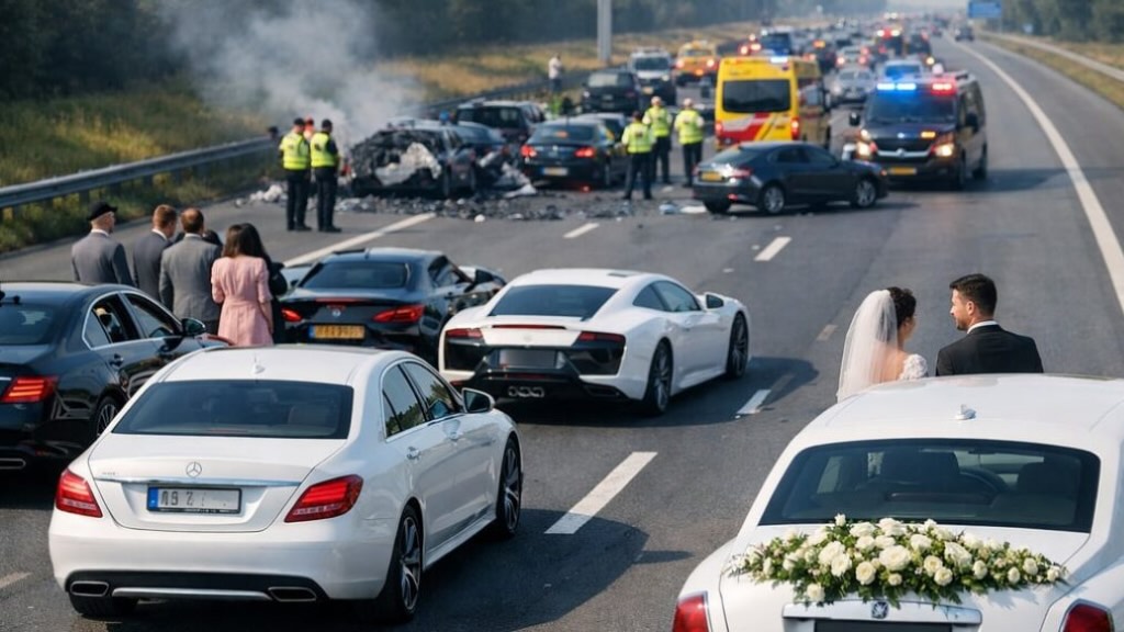 Wat een ontspannen rit richting een feestlocatie moest worden, veranderde in een paar tellen in een rommelig en duur verkeersdrama. Een bruiloftstoet met meerdere gehuurde luxeauto’s raakte op de snelweg betrokken bij een kettingbotsing, met flinke schade als gevolg.