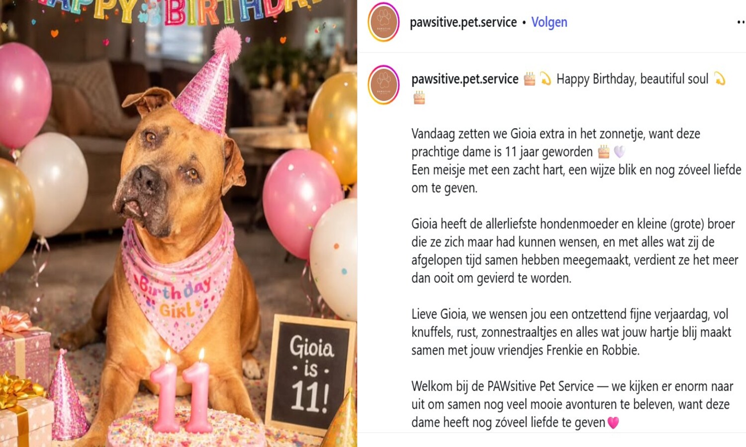 Monique sluit haar verhaal af met een boodschap die uit het hart komt. De afgelopen tijd leerde haar hoe belangrijk het is om te vertrouwen op je gevoel. Ze eindigt met de woorden: “Luister altijd naar je gevoel. Mijn meisje. Mijn warrior.” Het verhaal van Gioia raakt veel mensen. Het laat zien hoe diep de band tussen mens en dier kan zijn.